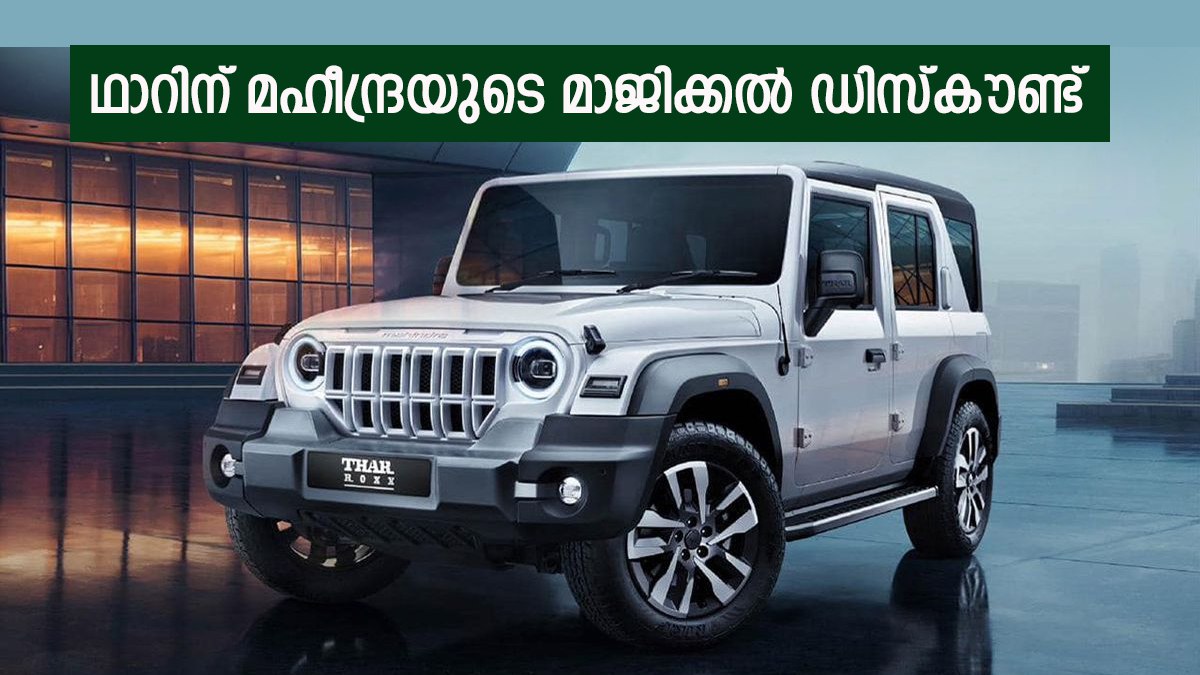1.75 ലക്ഷം രൂപവരെയുള്ള ഡിസ്കൗണ്ടാണ് ഥാറിന് മഹീന്ദ്ര നല്കുന്നത്. ഥാര് റോക്സിന്റെ ലോഞ്ചിന് ശേഷമാണ് ഇത്ര കിടിലനൊരു വിലക്കുറവ് കമ്പനി പ്രഖ്യാപിച്ചിരിക്കുന്നത്. കൂടുതല് ഉപയോക്താക്കളെ ആകര്ഷിക്കുക എന്ന തന്ത്രം കൂടി ഇതിന് പിന്നിലുണ്ട്.മഹീന്ദ്ര ഥാര് ഇപ്പോള് വാങ്ങുന്നവര് വിവിധ തരത്തിലുള്ള ഡിസ്കൗണ്ടാണ് ലഭിക്കുക.