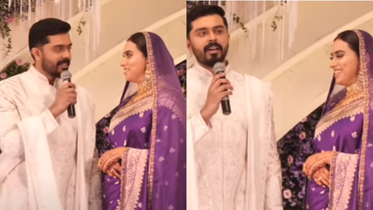 ആദ്യം നടൻ ജയറാം ആയിരുന്നു വേദിയിൽ സംസാരിച്ച് തുടങ്ങിയത്. പിന്നീടാണ് നവനീതിന് മൈക്ക് കൈമാറിയത്. ഇംഗ്ലീഷിൽ വളരെ മനോഹരമായിട്ടായിരുന്നു നവനീത് സംസാരിച്ച് തുടങ്ങിയത്. കുടുംബം ഒരുക്കിയ വിവാഹ സർപ്രൈസിന് നന്ദി പറഞ്ഞുകൊണ്ടായിരുന്നു നവനീത് സംസാരിച്ചത്. ഇതിനിടയിൽ നവനീതിന്റെ അച്ഛൻ ഇടപെട്ട് മലയാളത്തിൽ സംസാരിക്കാൻ ആവശ്യപ്പെടുകയായിരുന്നു. ഇതോടെ നവനീത് നല്ല അസ്സൽ മലയാളത്തിൽ സംസാരിച്ച് തുടങ്ങി.