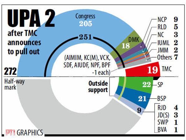 നിലവില് 540 അംഗങ്ങളുള്ള ലോകസഭയില് തൃണമൂല് കോണ്ഗ്രസിന്റെ പിന്തുണയോടെ മന്മോഹന് സിങ് സര്ക്കാറിനുണ്ടായിരുന്നത് 273 എംപിമാരുടെ പിന്തുണയാണ്. തൃണമൂലിന്റെ 19 എംപിമാരുടെ പിന്തുണ നഷ്ടമായതോടെ സര്ക്കാറിനെ പിന്തുണയയ്ക്കുന്ന എംപിമാരുടെ എണ്ണം 254ആയി. ബിഎസ്പിയും ആര്ജെഡിയും പിന്തുണ നല്കുകയാണെങ്കില് സര്ക്കാറിന് പിടിച്ചുനില്ക്കാന് സാധിക്കും. 22 എംപിമാരുള്ള സമാജ്വാദി പാര്ട്ടിയുടെ തീരുമാനവും നിര്ണായകമാകുംഭരിയ്ക്കാന് 272 അംഗങ്ങളുടെ പിന്തുണയാണ് വേണ്ടത്.