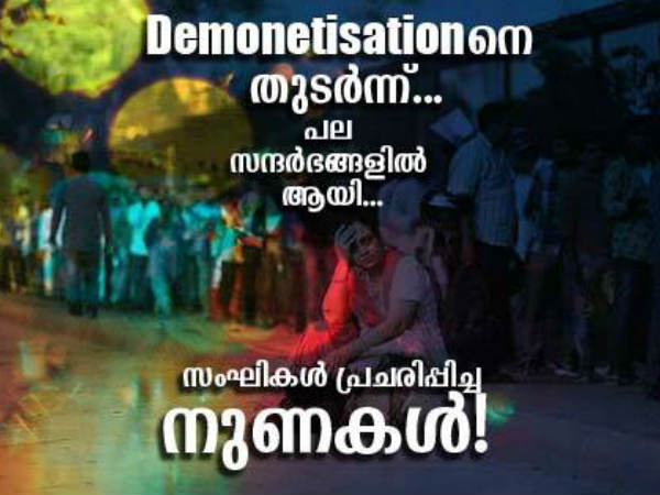 അതെല്ലാം മാറ്റി വയ്ക്കാം. എന്നാല് നോട്ട് നിരോധത്തെ അനുകൂലിക്കുന്നവരും ബിജെപി നേതാക്കളും പ്രവര്ത്തകരും എല്ലാം പറഞ്ഞ പലകാര്യങ്ങളും ശുദ്ധ അസംബന്ധങ്ങളായിരുന്നു. 'പൊതുജനതാത്പര്യാര്ത്ഥം' എന്ന ഫേസ്ബുക്ക് പേജില് പ്രസിദ്ധീകരിച്ച 'സംഘികള് പ്രചരിപ്പിച്ച നുണകള്' കാണാം...