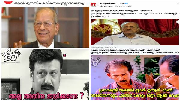 ട്രോളന്മാരെ മാത്രം ഇക്കാര്യത്തില് കുറ്റം പറയാന് പറ്റില്ല. അങ്ങനെയുള്ള കാര്യങ്ങളാണല്ലോ ഇ ശ്രീധരന് തള്ളിമറിക്കുന്നത്. ബിജെപി ആവശ്യപ്പെട്ടാന് കേരളത്തിന്റെ മുഖ്യമന്ത്രിയാകാന് തയ്യാറാണെന്നൊക്കെ പറഞ്ഞാല് പിന്നെ ട്രോളന്മാര്ക്ക് വെറുതേയിരിക്കാന് പറ്റുമോ...! ചില ട്രോളുകള് കണ്ടുനോക്കാം...