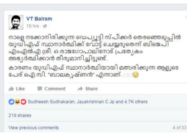 ഡെപ്യൂട്ടി സ്പീക്കര് തിരഞ്ഞെടുപ്പില് യുഡിഎഫ് സ്ഥാനാര്ത്ഥിക്ക് വോട്ട് ചെയ്യരുതെന്ന് ബിജെപി എംഎല്എ ശ്രീ ഒ രാജഗോപാലിനോട് പ്രത്യേകം അഭ്യര്ത്ഥിക്കാന് തീരുമാനിച്ചിട്ടുണ്ട്. കാരണം യുഡിഎഫ് സ്ഥാനാര്ത്ഥിയായി മത്സരിക്കുന്ന ആളുടെ പേര് ഐസി 'ബാലകൃഷ്ണന്' എന്നാണ്. 'ബാലകൃഷ്ണന്' എന്നത് ഇന്വര്ട്ടര് കോമയിലിട്ട് രാജേട്ടനിട്ട് ഒരു തട്ട് കൊടുത്തിരിക്കുകയാണ് ബല്റാം.