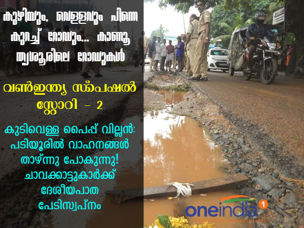 കുടിവെള്ള പദ്ധതിക്ക് പൈപ്പിടുന്നതിനായി പൊളിച്ച ദേശീയപാത ചാവക്കാട്ടുകാര്ക്കിപ്പോള് പേടിസ്വപ്നമാണ്. ചാവക്കാടുനിന്ന് ദേശീയപാതയിലൂടെ ചേറ്റുവയിലേക്കുള്ള റോഡാണ് തകര്ന്ന് തരിപ്പണമായത്. കുണ്ടും കുഴിയും നിറഞ്ഞ ദേശീയപാത മഴക്കാലം എത്തിയതോടെ ചെളിക്കുളമായ സ്ഥിതിയാണ്. ഏതാനും മീറ്റര് ദൂരമല്ല ദേശീയപാത തകര്ന്നിരിക്കുന്നത്. നാലുകിലോമീറ്റര് നീളത്തിലാണ് ദേശീയപാതയിലൂടെയുള്ള ദുരിതയാത്ര.