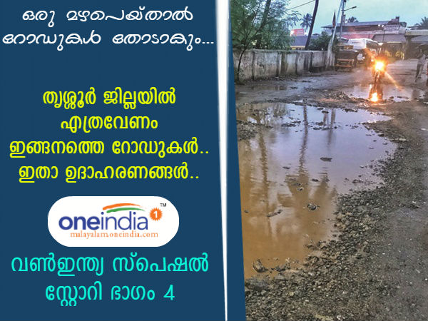 ഒരു ചെറിയ മഴ പെയ്ത് തോര്ന്നാല് മതി ജില്ലയിലെ ഒട്ടുമിക്ക റോഡുകളും തോടായി മാറും എന്നതാണ് തൃശ്ശൂരിലെ സ്ഥിതി. അശാസ്ത്രീയമായ കാനനിര്മാണമാണ് വില്ലന്. വെള്ളം ഒഴികി പോകാന് വേറെ വഴിയില്ല. കാനകള് മിക്കതും മാലിന്യവും ചെള്ളിയും വന്ന് മൂടിയിരിക്കുന്നു. ചിലതില് ഒരു ചെറുകാടുതന്നെ രൂപപ്പെട്ടിട്ടുണ്ട്. തൃശ്ശൂർ ജില്ലയിലെ റോഡുകളെക്കുറിച്ച് വണ്ഇന്ത്യ സ്പെഷൽ സ്റ്റോറി നാലാം ഭാഗം....