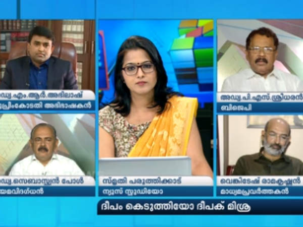 ദീപം കെടുത്തിയോ ദീപക് മിശ്ര എന്നതായിരുന്നു മാതൃഭൂമിയിലെ സൂപ്പര് പ്രൈം ടൈമിന്റെ ചര്ച്ചാ വിഷയം. ജസ്റ്റിസ് ജെ. ചെലമേശ്വറിന്റെ നേതൃത്വത്തില് നാല് സുപ്രീം കോടതി ജഡ്ജിമാര് വാര്ത്താ സമ്മേളനം നടത്തിയതിനെക്കുറിച്ചുള്ള ചര്ച്ച നയിച്ചത് സ്മൃതി പരുത്തിക്കാട് ആയിരുന്നു. ജസ്റ്റിസ് ലോയയുടെ മരണവുമായി ബന്ധപ്പെട്ട ചോദ്യമാണ് ചര്ച്ചയില് പങ്കെടുത്ത ബിജെപി നേതാവിനെ പ്രകോപിതനാക്കിയത്.
