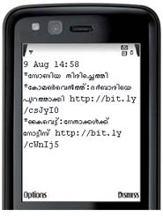 എവിടെയായിരുന്നാലും പ്രധാന വാര്ത്തകള് മലയാളത്തില് അറിയാന് എളുപ്പ മാര്ഗ്ഗമാണിത്. വാര്ത്തകള് മലയാളത്തില് നിങ്ങളുടെ മൊബൈല് ഫോണില് എസ്എംഎസ് ആയി കിട്ടും. വാര്ത്തയ്ക്കൊപ്പം ചെറിയ യുആര്എല്ലും ഉണ്ടാവും. നിങ്ങളുടെ മൊബൈലില് ഇന്റര്നെറ്റ് സൗകര്യം ഉണ്ടെങ്കില് അതില് ക്ലിക്ക് ചെയ്ത് വാര്ത്ത മുഴുവനും വായിയ്ക്കാം.