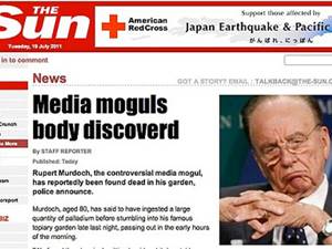 'മാധ്യമ രാജാവിന്റെ ശരീരം കണ്ടെത്തി എന്ന തലക്കെട്ടിലുള്ള വാര്ത്തയുടെ വിശദാംശങ്ങള് ഇങ്ങനെ. കനത്ത തോതില് പലേഡിയം (ഒരു തരം അപൂര്വ ലോഹം) അകത്താക്കിയതിനെത്തുടര്ന്നു മരിച്ചനിലയില് മര്ഡോക്കിന്റെ മൃതദേഹം തന്റെ പൂന്തോട്ടത്തില് കണ്ടെത്തി.