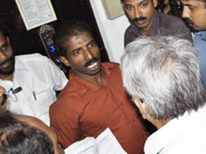 ചാണ്ടിയ്ക്കൊപ്പം വന്ന മന്ത്രിമാരായ കെ. ബാബുവും കെ.പി. മോഹനനും ഉള്പ്പെടെയുള്ളവര് ചോദ്യം ചെയ്യാന് ശ്രമിച്ചപ്പോഴാണ് ഇയാള് കസേര വിട്ട് എഴുന്നേറ്റത്. ഇതോടെ സെക്യൂരിറ്റി ജീവനക്കാരും സ്ഥലത്തെത്തി.