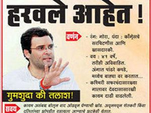 മഹാരാഷ്ട്രയിലെ കര്ഷകരുടെ പേരിലാണ് രാഹുല് ഗാന്ധിയെ കളിയാക്കുന്ന പരസ്യം പ്രത്യക്ഷപ്പെട്ടത്. രാഹുലിന്റെ ശൈലികളും വസ്ത്രധാരണ രീതിയും സ്വഭാവങ്ങളും വിവരിച്ച് മേല്പറയുന്ന ആളെ മഹാരാഷ്ട്രയിലെ കര്ഷകര് കാത്തിരിക്കുകയാണെന്നാണ് പരസ്യത്തിലുള്ളത്. രാഹുലിന്റെ ഫോട്ടോയുമുണ്ട്. ഇടക്കിടക്ക് വിവാദത്തിലകപ്പെടുകയും ദളിത്, കര്ഷക കുടിലുകളില്ച്ചെന്ന് കൂടെക്കൂടെ പാര്ക്കുന്ന വിചിത്ര സ്വഭാവവുമുള്ള ആളെന്നാണ് രാഹുലിനെ പരസ്യത്തില് വിശേഷിപ്പിയ്ക്കുന്നത്.