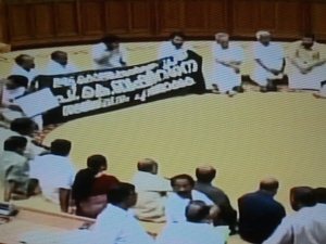 ഇതിനിടെ സ്പീക്കര് ചോദ്യോത്തരവേളയിലേക്ക് കടന്നു. തുടര്ന്ന് ഇരട്ടക്കൊലക്കേസിലെ പ്രതി ബഷീറിനെ സഭയില് പുറത്താണമെന്നെഴുതിയ വലിയ ബാനറുമായി പ്രതിപക്ഷാംഗങ്ങള് സഭയുടെ നടുത്തളത്തിലിറങ്ങുകയായിരുന്നു.