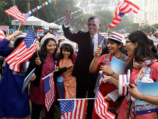 ബരാക് ഒബാമയുടെ കൂറ്റന് കട്ടൗട്ടിനു സമീപം അമേരിക്ക പതാക വീശികാണിക്കുന്ന ആരാധകര്. ദില്ലിയില് നിന്നുള്ള ദൃശ്യം.