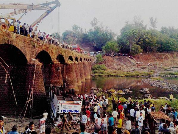 മുംബൈ: പടിഞ്ഞാറന് മഹാരാഷ്ട്രയിലെ രത്നഗിരിജില്ലയുടെ ഭാഗമായ ഖെഡിനടുത്തുവെച്ച് പാലത്തില് നിന്ന് ബസ് താഴേക്കു വീണ് 37 പേര് മരിച്ചു. 14 പേര്ക്ക് ഗുരുതരമായി പരിക്കേറ്റിട്ടുണ്ട്. പരിക്കേറ്റവരില് ബസ്സിന്റെ ഡ്രൈവറും ഉള്പ്പെടുന്നു. ഗോവയില് നിന്നും മുംബൈയിലേക്ക് പോകുന്ന ബസ്സാണ് അപകടത്തില് പെട്ടത്. പുലര്ച്ചെ 2.30ഓടു കൂടിയാണ് അപകടമുണ്ടായത്.
