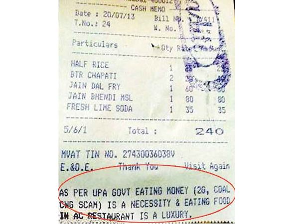 ടുജി, കല്ക്കരി, കോമണ്വെല്ത്ത് ഗെയിംസ് കുംഭകോണങ്ങളിലൂടെ കോടികള് വിഴുങ്ങിയ യുപിഎ സര്ക്കാറിന് എസി റസ്റ്റോറന്റില് ഭക്ഷണം കഴിയ്ക്കുന്നത് ലക്ഷ്വറിയായതിനാല് ലെവി ടാക്സ് ഈടാക്കേണ്ടി വരുന്നുവെന്ന് ഹോട്ടലിലെ ഓരോ ബില്ലിനു താഴെയും രേഖപ്പെടുത്തിവെച്ചതാണ് കോണ്ഗ്രസുകാരെ വിറളിപ്പിടിപ്പിച്ചിരുന്നു.