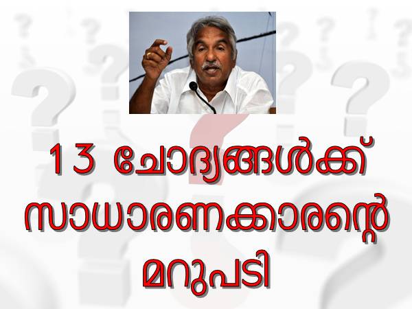 തിരുവനന്തപരം: സെക്രട്ടേറിയറ്റ് വളയല് സമരം നടത്തുന്ന പ്രതിപക്ഷത്തിനെതിരെ മുഖ്യമന്ത്രി ഉമ്മന് ചാണ്ടി ചോദിച്ചത് 13 ചോദ്യങ്ങളാണ്. ഇതിന് ഒരു സാധാരണക്കാരന്റെ പ്രതികരണമാണ് ചുവടെ