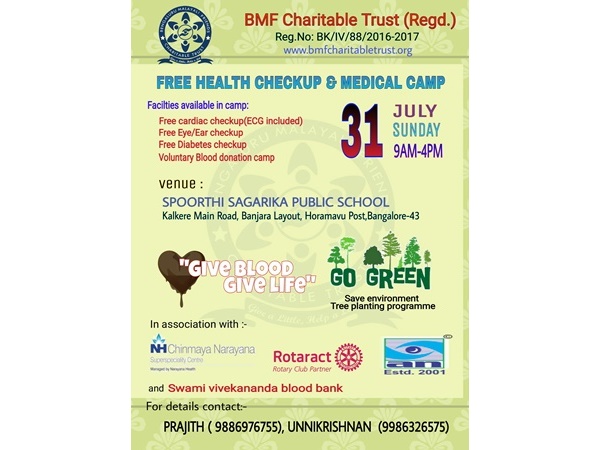 ഇതോടൊപ്പം രക്തദാനത്തിനുളള സൗകര്യവുമൊരുക്കിയിട്ടുണ്ട്. കാര്ഡിയാക് ,പ്രമേഹ,നേത്ര പരിശോധനയുമുണ്ടായിരിക്കും.ജീവകാരുണ്യ പ്രവര്ത്തന മേഖലയില് തങ്ങളുടേതായ വ്യക്തി മുദ്ര പതിപ്പിച്ച സംഘടനയാണ് ബെംഗളൂരു മലയാളി ഫ്രണ്ട്സ് ചാരിറ്റബിള് ട്രസ്റ്റ്. ഒട്ടേറെ കാരുണ്യ പ്രവര്ത്തനങ്ങളിലൂടെ ആലംബ ഹീനര്ക്ക് ആശ്രയമായി തീര്ന്ന ബി എം എഫ് ചാരിറ്റബിള് ട്രസ്റ്റ് മലയാളികള്ക്ക് ഏറെ സുപരിചിതമായ സംഘടനയാണ്.