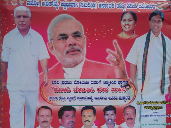 നരേന്ദ്രമോഡിയും യെഡിയൂരപ്പയും ഒന്നിച്ചുള്ള ഒട്ടേറെ ഫ്ളക്സ് ബോര്ഡുകള് നിരത്തിലുണ്ട്. എന്നാല് ഇത് ബി ജെ പിയോ കെ ജെ പിയോ ഔദ്യോഗികമായി സ്ഥാപിച്ചതാണോ എന്നതിന് പലതിലും ഉത്തരമില്ല. ഫാന്സുകാര് സ്ഥാപിക്കുന്ന തരത്തിലാണ് പല ബോഡുകളും കാണപ്പെടുന്നത്. കോര്പ്പറേഷന് സര്ക്കിളില് കാണുന്ന ചിത്രമാണ് വാര്ത്തയ്ക്കൊപ്പം ചേര്ത്തിരിക്കുന്നത്. ഇതിലും ഏതെങ്കിലും പാര്ട്ടിയുടെ പേര് പറയുന്നില്ല.