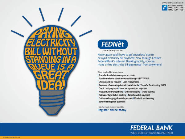 ഫെഡറല് ബാങ്കില് അക്കൗണ്ട് ഉണ്ടായാല് മാത്രം പോര. നെറ്റ് ബാങ്കിങ് കൂടി വേണം. അങ്ങനെയെങ്കില് ഒരു രൂപപോലും അധികം നഷ്ടപ്പെടാതെ, ക്യൂവില് കാത്ത് നില്ക്കാതെ നിങ്ങള്ക്ക് ബില് അടക്കാന് സാധിക്കും.