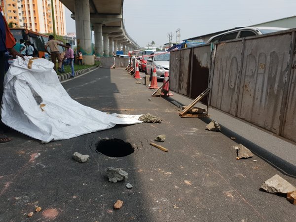 208ാം നമ്പർ മെട്രോ തൂണിനടുത്ത് തെക്ക് ഭാഗത്തായി റോഡിന്റെ സെൻട്രൽ മീഡിയനിൽ നിന്നും എട്ടടി വിട്ടാണ് റോഡിൽ ദ്വാരമുണ്ടായത്. പെട്ടെന്ന് കുഴി കണ്ട് വെട്ടിച്ച ബൈക്ക് യാത്രക്കാരനാണ് പോലീസിൽ വിവരമറിയിച്ചത്. വിവരമറിഞ്ഞ് ആലുവ ട്രാഫിക് എസ്.ഐ കബീറിന്റെ നേതൃത്വത്തിലെത്തിയ പോലീസ് സംഘം വലിയ മരപ്പട്ടിക വെച്ച് ഉൾഭാഗത്തിന്റെ ആഴവും വിസ്തൃതിയും കണക്കാക്കി റോഡിൽ മാർക്ക് ചെയ്തു. തുടർന്ന് റോഡിൽ കയറ് കെട്ടിത്തിരിച്ച് വാഹനങ്ങൾ തിരിച്ചുവിട്ടു. റോഡിന് നല്ല വീതിയുള്ള പ്രദേശമായതിനാൽ വാഹനങ്ങൾക്ക് കടന്നു പോകാൻ തടസ്സമുണ്ടായില്ല. എന്നാലും മുട്ടം മുതൽ എറണാകുളം ഭാഗത്തേക്ക് രാവിലെ ചെറിയ രീതിയിൽ ഗതാഗത തടസ്സം അനുഭവപ്പെട്ടു.
