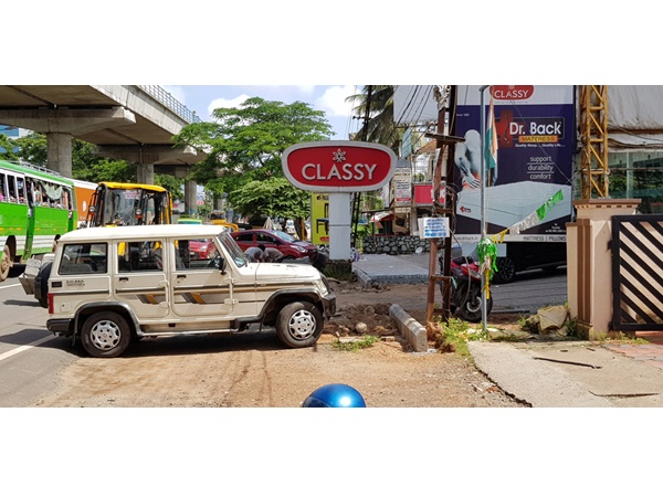 മെട്രോ നിർമ്മാണവുമായി ബന്ധപ്പെട്ട് സൗന്ദര്യ വത്കരണത്തിന്റെ ഭാഗമായി ഈ ഭാഗത്ത് നടപ്പാത നിർമ്മാണം തുടങ്ങിയപ്പോഴാണ് പരസ്യബോർഡ് പത്തടിയോളം ദേശീയ പാതയിലേക്ക് കയറ്റിയാണ് സ്ഥാപിച്ചിരിക്കുന്നതെന്നു വ്യക്തമാകുന്നത്. സ്ഥാപനത്തിന്റെ സ്ഥലത്തു സ്ഥാപിക്കേണ്ട ബോർഡാണ് നടപ്പാതയും കഴിഞ്ഞു ദേശീയ പാതയിൽ സ്ഥാപിച്ചിരിക്കുന്നത്. നഗരസഭയുടെ മൂക്കിന് താഴെ സ്ഥാപിച്ചിരിക്കുന്ന ഈ പരസ്യ ബോർഡ് നഗരസഭാ അധികാരികൾ കാണാഞ്ഞതോ, കണ്ണടച്ചതോ.