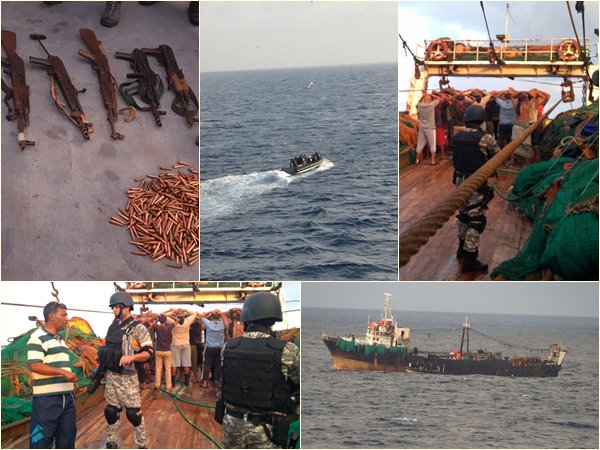 സംശയകരമായ സാഹചര്യത്തിൽ നീങ്ങിയ ബോട്ടിനെ നിരീക്ഷണ കപ്പൽ പിന്തുടർന്നു തടഞ്ഞു നിർത്തുകയായിരുന്നു. തുടർന്നു നടത്തിയ പരിശോധനയിലാണ് ബോട്ടിൽ നിന്ന് എകെ-47 ഉൾപ്പെടെ അഞ്ചു തോക്കുകളും 471 റൗണ്ട് വെടിയുണ്ടകളും പിടിച്ചെടുത്തത്. ബോട്ടിനെ പിന്നീട് പോകാൻ അനുവദിച്ചു. കഴിഞ്ഞ ഒൻപതിനു നടന്ന മറ്റൊരു ഓപ്പറേഷനിൽ സൊമാലിയൻ തീരത്തു നിന്നും നാല് എകെ-47 തോക്കുകളും ഒരു ലൈറ്റ് മിഷീൻ ഗണ്ണും പിടിച്ചെടുത്തിരുന്നു.