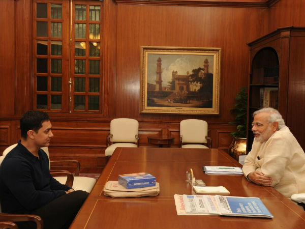 — Aamir Khan (@aamir_khan) June 23, 2014 സൗത്ത് ബ്ലോക്കിലുള്ള നരേന്ദ്രമോദിയുടെ ഓഫീസില് വച്ചായിരുന്നു കൂടിക്കാഴ്ച. കൂടിക്കാഴ്ചയ്ക്കു ശേഷം അമീര്ഖാന് തന്നെയാണ് ഇക്കാര്യം ട്വിറ്ററിലൂടെ അറിയിച്ചത്.