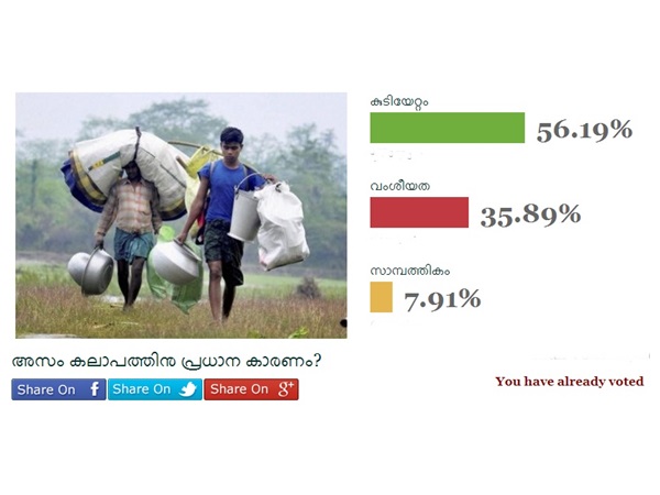 വംശീയവും സാമ്പത്തികവും ആയ കാരണങ്ങളല്ല, മുസ്ലിം കുടിയേറ്റമാണ് അസമിലെ കലാപത്തിന് കാരണമെന്നാണ് വണ് ഇന്ത്യയുടെ വായനക്കാരില് ഭൂരിഭാഗവും പറയുന്നത്. വണ് ഇന്ത്യ സര്വ്വേയില് പങ്കെടുത്ത 56.62 ശതമാനം ആളുകളും ഈ അഭിപ്രായക്കാരാണ്. വംശീയമായ ആക്രമണമാണ് നടന്നത് എന്ന് അഭിപ്രായം പറഞ്ഞവര് 35.76 ശതമാനം പേരുണ്ട്. ഇത് രണ്ടുമല്ല, സാമ്പത്തികമായ കാരണങ്ങളാണ് കലാപത്തിന് പിന്നില് എന്ന് വിശ്വസിക്കുന്നവര് 7.62 ശതമാനമാണ്.