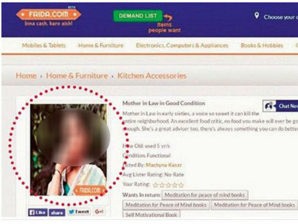 പ്രശ്നക്കാരിയായ അമ്മായിയമ്മയെ മരുമകള് ഓണ്ലൈനില് വില്പ്പനയ്ക്ക് വച്ചു, മലയാളി?