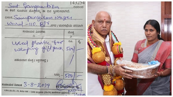 Karnataka: Bengaluru Mayor Gangambike Mallikarjun paid Rs 500 fine for presenting a gift wrapped in plastic to Chief Minister BS Yediyurappa. Plastic was banned by Bruhat Bengaluru Mahanagara Palike (BBMP) in 2016. pic.twitter.com/4To7o9BAGQ