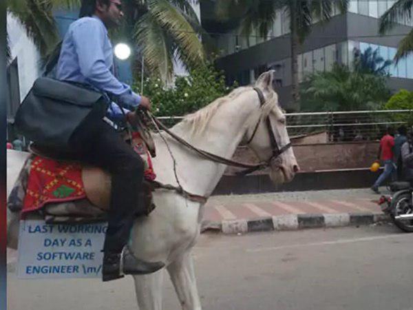 ബെംഗളൂരു: വെള്ളക്കുതിരയ്ക്ക് മേൽ ഇരുന്ന് റോഡിലൂടെ കുതിച്ചുപായുന്ന ഒരു ചെറുപ്പക്കാരനെ കണ്ട് അമ്പരന്നുപോയി ബെംഗളൂരു നിവാസികൾ. ഷർട്ട് ഇൻ ചെയ്ത്,ലാപ്ടോപ്പ് ബാഗ് തോളിലിട്ട്, ടൈയും കെട്ടി കുതിരപ്പുറത്തെത്തിയ യുവാവായിരുന്നു കഴിഞ്ഞ ദിവസം നഗരത്തിലെ ചർച്ചാ വിഷയം. ബെംഗളൂരുവിൽ സോഫ്റ്റ് വെയർ എഞ്ചിനീയറായ രൂപേഷ് കുമാറാണ് നഗരത്തിലെ പ്രധാന റോഡിലൂടെ കുതിരപ്പുറത്തിരുന്ന് പാഞ്ഞത്.