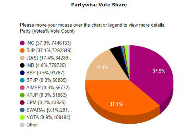 അതായത് സംസ്ഥാനത്ത് ഏറ്റവുമധികം വോട്ട് ഷെയര് നേടിയ പാര്ട്ടി കോണ്ഗ്രസാണ്. പക്ഷേ പറഞ്ഞിട്ടെന്താണ് കാര്യം. തോല്ക്കാനാണ് വിധി. ബിജെപി അധികം പിന്നിലല്ല. 37.1 ശതമാനം വോട്ടുകളാണ് ബിജെപിക്ക് ലഭിച്ചത്. എന്നാല് ജെഡിഎസ് അത്യാവശ്യം പിന്നിലാണ്. വെറും 17.4 ശതമാനം വോട്ടാണ് അവര്ക്ക് ലഭിച്ചിരിക്കുന്നത്. ഐന്ഡിയാണ് നാലു ശതമാനം വോട്ടോടെ നാലാം സ്ഥാനത്തുള്ള. നോട്ട കര്ണാടകയില് വലിയ നേട്ടമുണ്ടാക്കിയിട്ടില്ല. അതേസമയം ഈ നേട്ടം മാത്രമാണ് തല്ക്കാലം കോണ്ഗ്രസിന് അഭിമാനിക്കാനുള്ളത്. മറുവശത്ത് ബിജെപി 2013ല് തോറ്റ മണ്ഡലങ്ങള് പോലും തിരിച്ചുപിടിച്ചിരിക്കുകയാണ്.