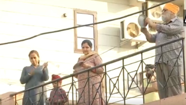 #WATCH Uttarakhand: People come out on their terraces and balconies to clap, clang utensils and ring bells to express their gratitude to those providing essential services amid. Visuals from Dehradun. #CoronavirusPandemicpic.twitter.com/dFapwYUYcx
