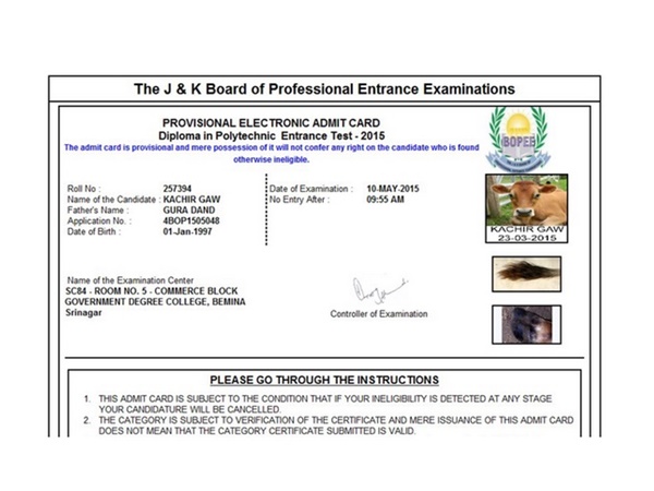 ഇക്കഴിഞ്ഞ മെയ് രണ്ടിനാണ് കശ്മീരിലെ പ്രഫഷനല് എന്ട്രന്സ് എക്സാമിനേഷന് ബോര്ഡ് പശുവിന് അഡ്മിറ്റ് കാര്ഡ് അയച്ച് .അബ്ദുല് റഷീദ് എന്ന ബഡ്ഗാം സ്വദേശിയാണ് പശുവിന്റെ മകള് എന്ന് അര്ഥം വരുന്ന കാച്ചിര് ഗൗവ എന്ന പേരില് ഓണ്ലൈന് വഴി ബോര്ഡിന് അപേക്ഷ നല്കിയത്.