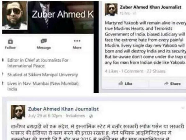 സുബേര് അഹമ്മദ് ഖാന് എന്ന അക്കൗണ്ടിലൂടെയാണ് ഇയാള് പോസ്റ്റ് ചെയിതിരുന്നത്. മാധ്യമ പ്രവര്ത്തകനെന്നാണ് ഇയാള് സ്വയം പരിചയപ്പെടുത്തിയത്. മേമന് അനുഭാവിയായ ഇയാള് രാജ്യത്ത് മുസ്ലിങ്ങള്ക്കെതിരെ അതിക്രമങ്ങള് നടക്കുകയാണെന്നും ഹിന്ദു തീവ്രവാദികളും സര്ക്കാരും മോശക്കാരാണെന്നും തന്റെ പോസ്റ്റില് പറഞ്ഞു.