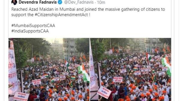 പരിപാടിയുടെ വേദിയില് എത്തിയതിന് പിന്നാലെ വന് ജനക്കൂട്ടത്തിന്റെ ചിത്രം ഫട്നാവിസ് ട്വിറ്ററില് പങ്കുവെച്ചു. മുദ്രാവാക്യങ്ങള് എഴുതിയ ബാനറുകളും ദേശീയ പതാകകളും കയ്യിലേന്തിയ ജനക്കൂട്ടത്തിന്റെതായിരുന്നു ചിത്രങ്ങള്. മുംബൈയിലെ ആസാദ് മൈദാനിലെത്തി, പൗരത്വ ഭേദഗതി നിയമത്തെ പിന്തുണയ്ക്കുന്ന വന് ജനക്കൂട്ടത്തിനൊപ്പം ചേര്ന്നു എന്നാണ് ട്വീറ്റില് ഫട്നാവിസ് കുറിച്ചത്. #MumbaiSupportsCAA, #IndiaSupportsCAA എന്നീ ഹാഷ് ടാഗുകളും ട്വീറ്റിലുണ്ട്.