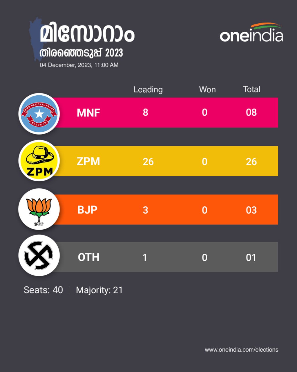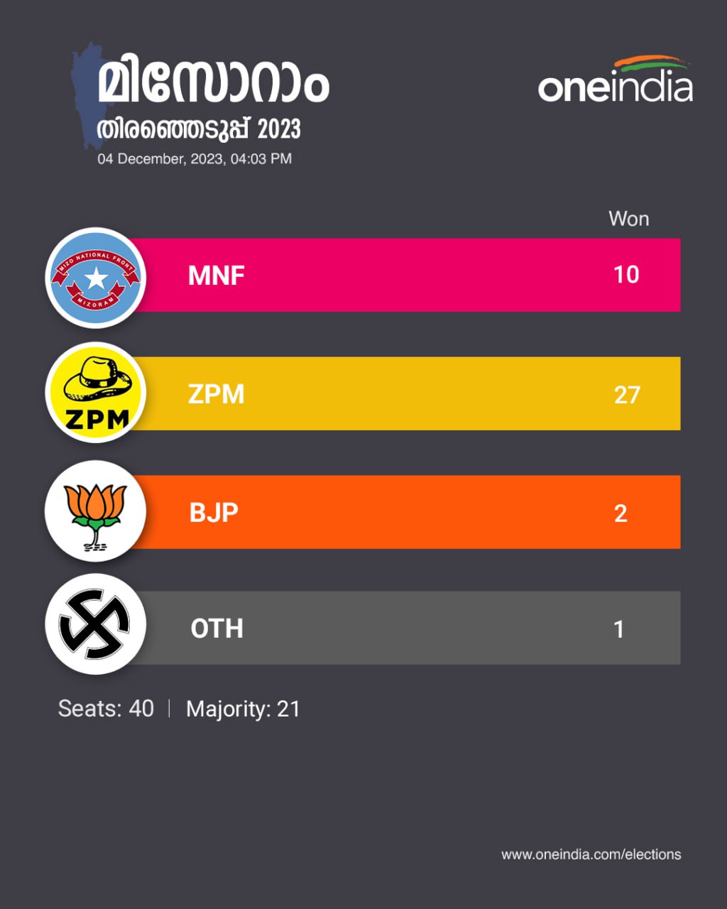 മിസോറാമിൽ സോറാം പീപ്പിൾസ് മൂവ്മെന്റിന് 27 സീറ്റ്, ഭരണകക്ഷിയായ എംഎൻഎഫിന് പത്ത് സീറ്റുകൾ മാത്രം, ബിജെപി രണ്ടും മറ്റുള്ളവർ ഒരു സീറ്റും നേടി.