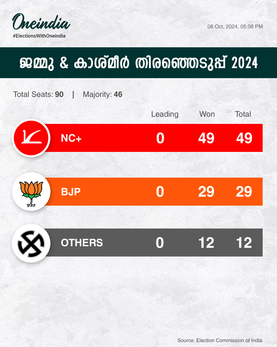 അതിനിടെ കശ്മീരിൽ എൻസി-കോൺഗ്രസ് സഖ്യം മുന്നേറ്റം തുടരുകയാണ്. നിലവിലെ സാഹചര്യത്തിൽ പിഡിപി ഉൾപ്പെടയുള്ള കക്ഷികളുമായി കോൺഗ്രസും എൻസിയും ഭരണത്തിനായി കൈകോർക്കുമോ എന്നാണ് കണ്ടറിയേണ്ടത്. ഇത് സംബന്ധിച്ച സൂചനകൾ ഒന്നും തന്നെ ഇതുവരെ വന്നിട്ടില്ലെങ്കിലും ഭാവിയിൽ ഇത്തരം സാധ്യതകൾ തള്ളിക്കളയാൻ കഴിയില്ല എന്നാണ് വിവിധ കോണുകളിൽ നിന്ന് ഉയരുന്ന അഭിപ്രായം.