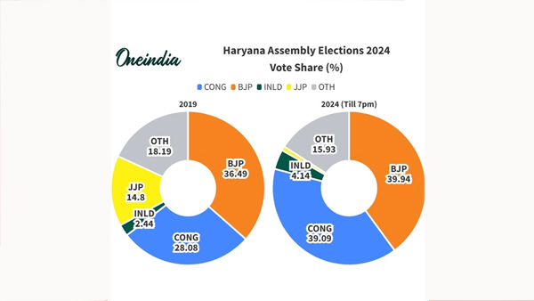 ഹരിയാനയിലെ 2019 ലേയും 2024 ലേയും വോട്ടുവിഹിതം തമ്മിലുള്ള താരതമ്യം
