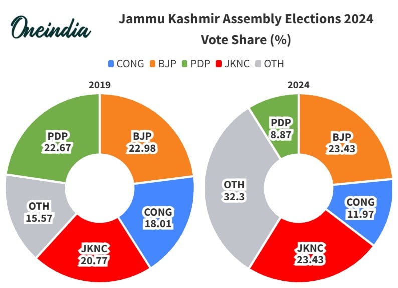 ജമ്മു കശ്മീരില് 2019 ലേയും 2024 ലേയും വോട്ടുവിഹിതം തമ്മിലുള്ള താരതമ്യം