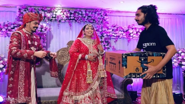 ആമസോണിലെ ഗ്രൂപ്പ് ഓപ്പറേഷണല് മാനേജറായ വധുവിന് വരന് ഒരുക്കിയ സര്പ്രൈസാണ് വേദിയില് സംഭവിച്ചത്. വിവാഹസമയത്ത് കഴുത്തില് ചാര്ത്തേണ്ട പൂമാല നഷ്ടപ്പെട്ടതായി വരന് അഭിനയിക്കുകയായിരുന്നു. തുടര്ന്ന് ആമസോണ് ഡെലിവെറി ബോയ് ഒരു ബോക്സുമായി സ്റ്റേജിലെത്തി. അയാളുടെ കൈയിലെ ബോക്സില് പൂമാലയാണുണ്ടായിരുന്നത്.