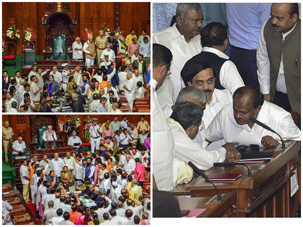ഗവര്ണര് വാജുഭായ് വാലയുടെ പ്രസംഗം അംഗങ്ങള് തടസപ്പെടുത്തി. സര്ക്കാരിന് ഭൂരിപക്ഷമില്ലെന്നും സര്ക്കാര് രാജിവെയ്ക്കണമെന്നും ബിജെപി നടുത്തളത്തിലിറങ്ങി ബഹളം വെച്ചു. എംഎല്എമാരെ കാണാതായതോടെ കോണ്ഗ്രസ് നിയമസഭാ കക്ഷി നേതാവും മുന് മുഖ്യമന്ത്രിയുമായ സിദ്ധരാമയ്യ വീണ്ടും എംഎല്എമാര്ക്ക് വിപ്പ് നല്കി.