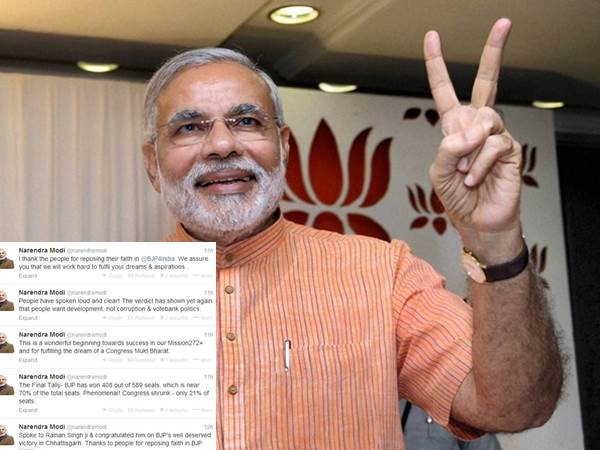 വോട്ടെണ്ണിത്തുടങ്ങി ലീഡ് ബി ജെ പിയ്ക്കാണെന്നറിഞ്ഞതുമുതലുള്ള മോഡിയുടെ ട്വീറ്റ് കോണ്ഗ്രസിനിട്ട് താങ്ങിക്കൊണ്ടായിരുന്നു. ഒപ്പം ബി ജെ പി സ്ഥാനാര്ത്ഥികളെ അഭിനന്ദക്കുന്നതും. ഒടുവില് വിജയം ബി ജെ പി തന്നെ സ്വന്തമാക്കി. മോഡി ട്വിറ്ററില് കുറിച്ചു 'ഇനി ലക്ഷ്യം കോണ്ഗ്രസ് മുക്ത ഭാരതം'