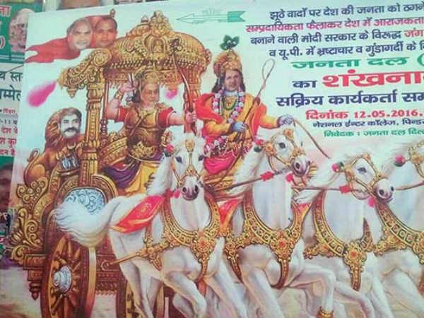 ജെഡിയു സമ്മേളനത്തിന്റെ വേദിയാണ് പിന്ദ്ര. ബീഹാര് ആസ്ഥാനമായുള്ള പാര്ട്ടി അയല് സംസ്ഥാനമായ ഉത്തര്പ്രദേശിലേക്ക് നടത്തുന്ന ആദ്യ കാല്വെപ്പാണിത്. നിതീഷിനെ അര്ജുനനായി ചിത്രീകരിച്ചിരിക്കുന്ന പോസ്റ്ററില് മുതിര്ന്ന നേതാവായ ശരത് യാദവിനെയാണ് കൃഷ്ണനായി കാണിച്ചിരിക്കുന്നത്.
