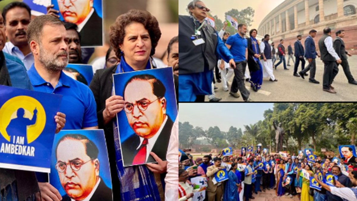 ഇന്ന് രാവിലെ തന്നെ പ്രിയങ്ക ഗാന്ധിയുടേയും രാജ്യസഭ പ്രതിപക്ഷ നേതാവ് മല്ലികാർജ്ജുൻ ഖാർഗെയുടേയും നേതൃത്വത്തിൽ പ്രതിപക്ഷ എംപിമാർ പാർലമെന്റ് കവാടത്തിന് മുന്നിൽ പ്രതിഷേധിച്ചിരുന്നു. ഐആം അംബേദ്കർ എന്നെഴുതിയ പ്ലക്കാർഡുമായി വിജയ് ചൗക്കിൽ നിന്നും മാർച്ച് നടത്തിയാണ് നേതാക്കൾ പാർലമെന്റ് കവാടത്തിലെത്തിയത്. അംബേദ്കറിനെ അപമാനിച്ച അമിത് ഷാ മാപ്പ് പറയണമെന്ന് നേതാക്കൾ ആവർത്തിച്ചു.