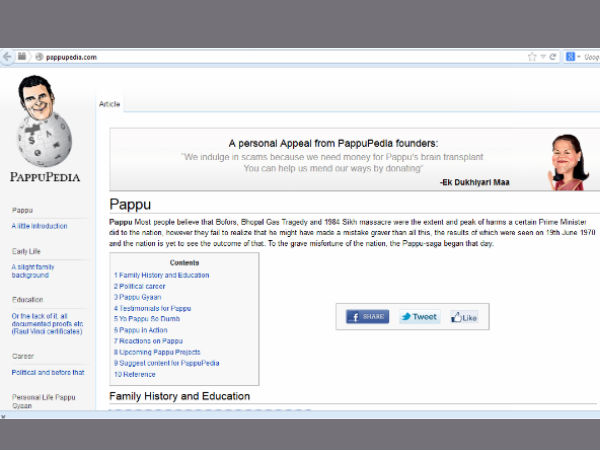 ഇന്ത്യന് പ്രധാനമന്ത്രിമാരെക്കൊണ്ട നാടിനുണ്ടായ ദുരന്തങ്ങള് ബോഫേഴ്സ് കേസ്, ഭോപ്പാല് ദുരന്തം, സിഖ് കലാപം തുടങ്ങിയവയില് ഒതുങ്ങുന്നില്ലെന്നാണ് സൈറ്റ് പറയുന്നത്. 1970 ജൂണ് 19 ന് പപ്പുവിന്റെ ജനനമാണ് ഏറ്റവും വലിയ ദുരന്തമെന്നും സൈറ്റില് കളിയാക്കി പറയുന്നുണ്ട്.