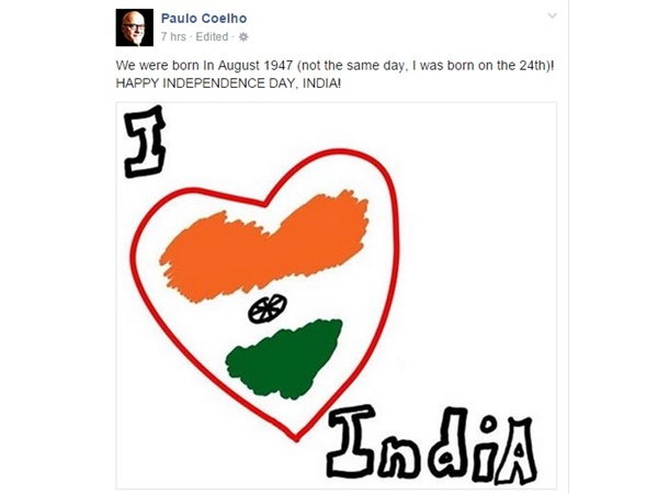 ഐ ലവ് ഇന്ത്യ എന്നെഴുതിയ ഒരു ചിത്രമാണ് അദ്ദേഹം പോസ്റ്റു ചെയ്തത്. ഇന്ത്യയും താനും ജനിച്ചത് ഒരേ വര്ഷമാണ് എന്നാല് ഒരു ദിവസമല്ല താന് ആഗസ്റ്റ് 24 ആം തീയതിയാണ് ജനിച്ചതെന്നും പൗലോ കൊയ്ലോ ഫെയ്സ് ബുക്കില് കുറിച്ച പോസ്റ്റില് പറയുന്നു.
