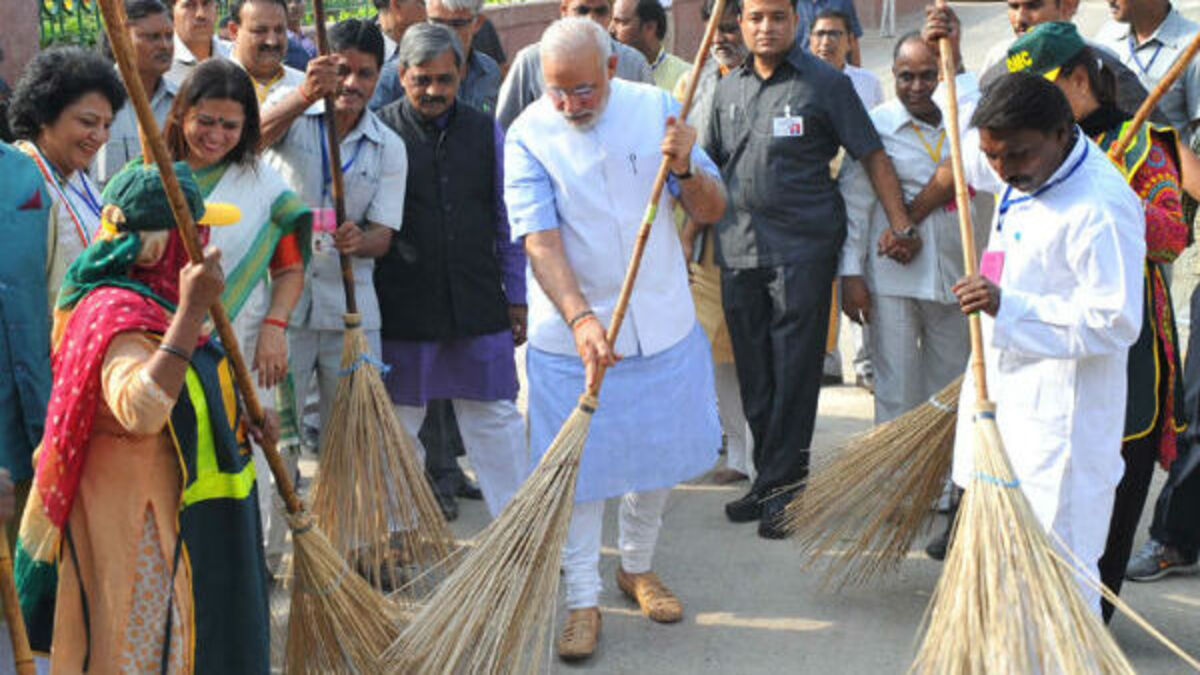 ശുചിത്വ സന്ദേശവുമായി പ്രധാനമന്ത്രി; ഗുസ്തി താരത്തിനൊപ്പം തൂത്തുവാരി നരേന്ദ്ര മോദി
