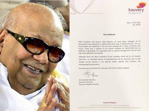 കാവേരി ആശുപത്രിയിലെത്തിയ കോൺഗ്രസ് അധ്യക്ഷൻ രാഹുൽ ഗാന്ധിയെ എം കെ സ്റ്റാലിൻ, മുൻ കേന്ദ്രമന്ത്രി ദയാനിധി മാരൻ, മുതിർന്ന ഡിഎംകെ നേതാക്കൾ എന്നിവർ ചേർന്ന് സ്വീകരിച്ചു. ദീർഘകാലത്തെ ബന്ധമാണ് കരുണാനിധിയുമായി ഉളളത്, ധൈര്യമുള്ള നേതാവാണ് അദ്ദേഹം, ആരോഗ്യനില മെച്ചപ്പെട്ടു എന്നറിഞ്ഞതിൽ സന്തോഷമുണ്ടെന്നും പ്രതികരിച്ചു. സോണിയ ഗാന്ധിയുടെ അന്വേഷണം കരുണാനിധിയുടെ കുടുംബത്തെ അറിയിച്ചെന്നും രാഹുൽ ഗാന്ധി പറഞ്ഞു. കലൈജ്ഞറുടെ ആരോഗ്യ നില മെച്ചപ്പെട്ടെങ്കിലും അണികൾ ആശങ്കയിലാണ്. തമിഴ്നാടിന്റെ വിവിധഭാഗങ്ങളിൽ നിന്നും ചെന്നൈയിലേക്ക് ആളുകൾ എത്തുന്നു. ആശുപത്രി പരിസരത്തെ പോലീസ് സുരക്ഷയും ഗതാഗത നിയന്ത്രണവും തുടരുകയാണ്.
