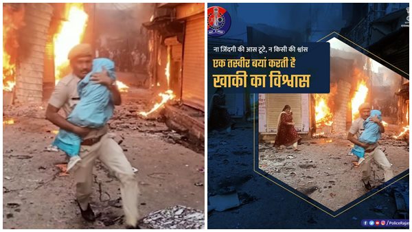 ജയ്പൂര്: സോഷ്യല് മീഡിയയുടെ കയ്യടി നേടി ഒരു പോലീസ് കോണ്സ്റ്റബിള്. കരൗലിയിലുണ്ടായ സാമുദായിക കലാപത്തിനിലെ സ്വന്തം ജീവന് പണയം വെച്ച് ഒരു കുഞ്ഞിന്റെ ജീവന് രക്ഷിച്ചാണ് പോലീസ് കോണ്സ്റ്റബിളായ നേത്രേഷ് ശര്മ ഹീറോ ആയിരിക്കുന്നത്. 31കാരനായ നേത്രേഷ് ശര്മ രാജസ്ഥാന് പോലീസിലെ കോണ്സ്റ്റബിളാണ്. കലാപത്തിനിടെ തീവെപ്പില് കുടുങ്ങിയ രണ്ട് സ്ത്രീകളില് നിന്നും കുഞ്ഞിനെ വാങ്ങി നെഞ്ചില് ചേര്ത്ത് പിടിച്ച് പുറത്തേക്ക് ഓടുന്ന നേത്രേഷിന്റെ ചിത്രം സോഷ്യല് മീഡിയയില് വൈറലാണ്.