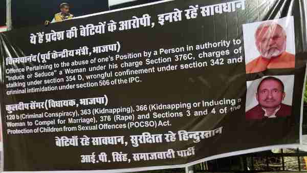 സമാജ്വാദി പാര്ട്ടിയുടെ ദേശീയ വക്താവായ ഐപി സിങാണ് പോസ്റ്റര് സ്ഥാപിച്ചത്. ഹിന്ദിയിലാണ് പോസ്റ്റര് എഴുതിയിരിക്കുന്നത്. ഇവരാണ് സംസ്ഥാനത്തെ കുറ്റവാളികള്. അവരില് നിന്നും അകലം പാലിക്കൂവെന്നും പോസ്റ്ററില് പറയുന്നു. കുല്ദീപ് സീങ് സെനഗറിന്റേയും ചിന്മയാനന്ദിന്റേയും ചിത്രവും അതോടൊപ്പം അവര്ക്കെതിരെയുള്ള കുറ്റങ്ങളും പോസ്റ്ററില് ഉണ്ട്. ഇന്നലെ രാത്രി മുതലായിരുന്നു പോസ്റ്റര് പ്രത്യക്ഷപ്പെട്ടത്. രാവിലെ പൊലീസ് അത് നീക്കം ചെയ്തു.