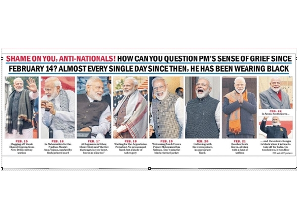 ഇതിനെയെല്ലാമാണ് ടെലിഗ്രാഫ് മോദിയുടെ ഫോട്ടോകളിലൂടെ തന്നെ പൊളിച്ചടുക്കിയിരിക്കുന്നത്. ഫിബ്രവരി 14 നാണ് പുല്വാമ ആക്രമണം നടന്നത്. അതിന് പിറ്റേദിവസമായ 15 മുതല് 21 വരെ മോദി പങ്കെടുത്ത വിവിധ പരിപാടികളില് ആഹ്ളാദം പ്രകടിപ്പിച്ചും ചിരിച്ചും നില്ക്കുന്ന മോദിയുടെ ചിത്രങ്ങള് ഇക്കൂട്ടത്തില് ഉണ്ട്.